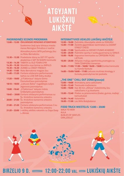 Renginį 12 val. oficialiai atidarys Vilniaus meras kartu su svečiais bei Lietuvos muzikos ir teatro akademijos pučiamųjų orkestru. Iškart po to, aikštėje prasidės ir iki vėlaus vakaro vyks beveik 20 skirtingų sportinių, interaktyvių veiklų į kurias galės įsitraukti įvairaus amžiaus vilniečiai. Renginį ves ir savo pasirodymą ant pagrindinės scenos 16 val. surengs žymus magas Rokas Bernatonis.