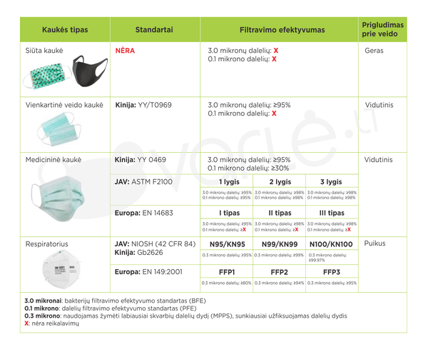 Tam, kad susigaudyti būtų lengviau, „Varlė.lt“ komanda surinko informaciją apie prieinamas veido kaukes ir respiratorius bei sudarė lyginamąją lentelę, kurioje matyti esminiai skirtingų kaukių tipų skirtumai bei ypatumai.