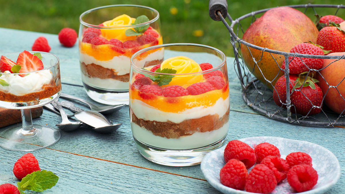 Mangų ir aviečių desertas su maskarpone
