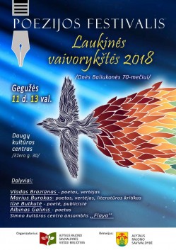 Renginio metu skambės poetės eilės bei amžininkų atsiminimai, bus parodyti LRT laidos „Brydė“ archyviniai kadrai, kurioje poetę Onę Baliukonę kalbins profesorė Viktorija Daujotytė. Festivalyje dalyvaus ir savo naujausius kūrinius pristatys poetas, vertėjas, eseistas, Nacionalinės kultūros ir meno premijos laureatas Vladas Braziūnas, poetas, literatūros kritikas Marius Burokas, poetė, fotografė Ilzė Butkutė bei poetas Albinas Galinis. Susirinkusiems koncertuos Kultūros centro Simno skyriaus ansamblis „Flaya“. Festivalio metu taip pat vyks geriausio eilėraščio konkurso nugalėtojų paskelbimas bei laureato apdovanojimas „Laukinės vaivorykštės“ skulptūrėle. Maloniai kviečiame dalyvauti.