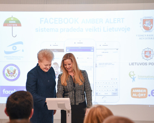 Lietuvos Respublikos Prezidentė Dalia Grybauskaitė kartu su pasaulinio socialinio tinklo „Facebook“ Saugumo ir patikros departamento vadove Emily Vacher aktyvavo dingusių vaikų paieškai skirtą sistemą „Amber Alert“.