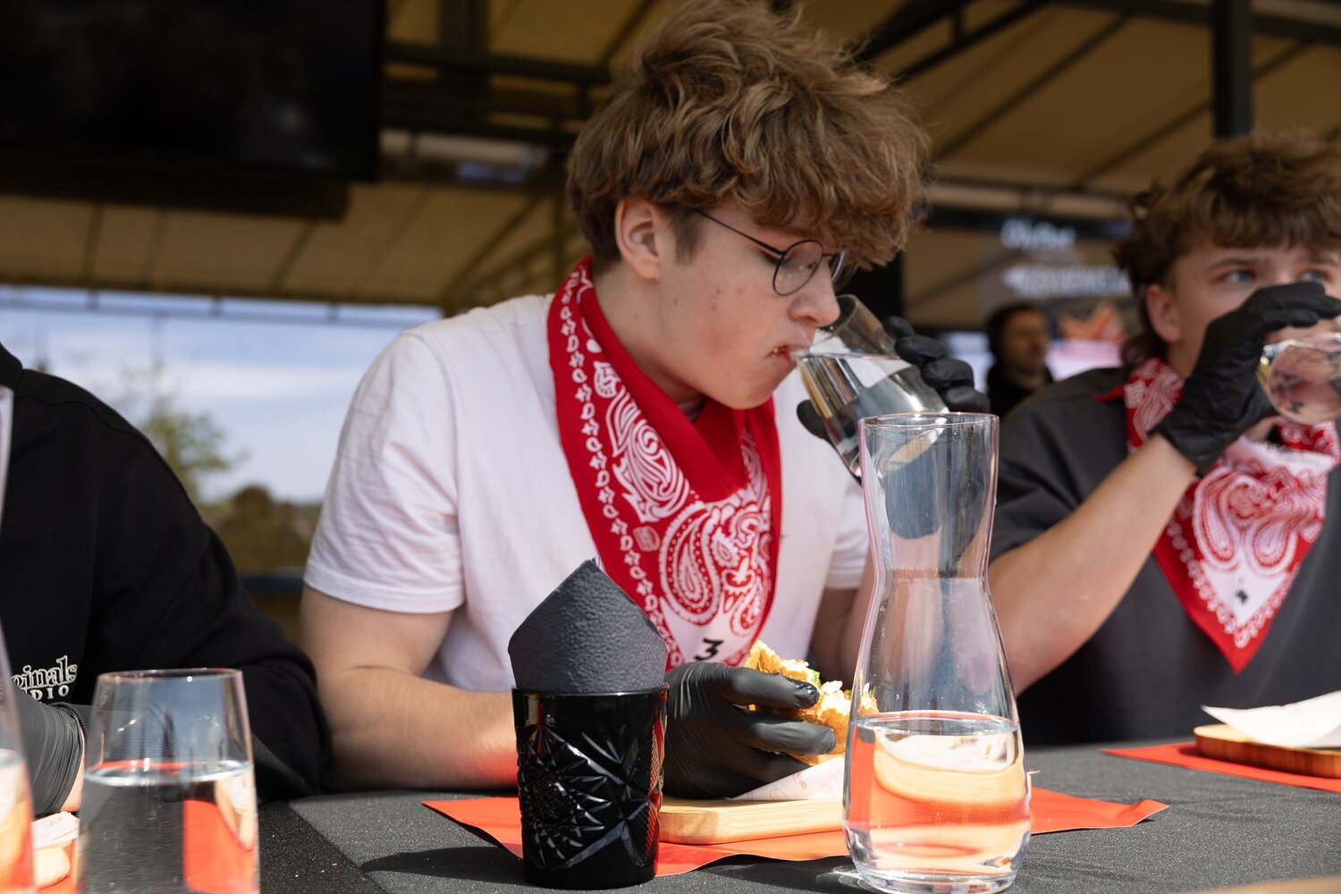 Šalia Baltojo tilto esančio baro lauko terasoje vykusiame turnyre iš viso rungėsi 10 išalkusių dalyvių, kurių laukė keturių etapų iššūkis. Kiekviename etape valgytojai mėgino kuo greičiau įveikti po vieną mėsainį: didžiulį NBA krepšininko Jono Valančiūno vardo čempiono burgerį arba baro naujieną – visiškai uždarą „Oly mėsainį“ su brandinta wagyu jautiena.
