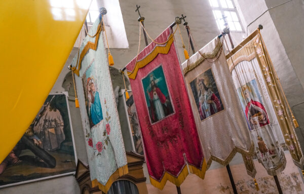 Bažnyčia pasitinka gausybe spalvų, vėliavų ir skulptūrų. Jos – medinės, dar XVII amžiaus. „Svarbiausias dalykas – altorius. Seniausias Lietuvoje išlikęs medinis altorius, sukurtas tada, kai atsidarė bažnyčia. Beje, kiek laiko turite, nes galime čia praleisti ir pusę dienos – pralėks nepastebint“, – sako Regimantas.