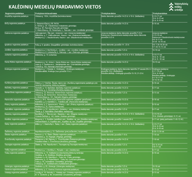 VĮ Valstybinių miškų urėdija pradėjo prekybą Kalėdų medeliais. Įmonės regioninių padalinių  medelynuose ir girininkijose galima įsigyti medelių iš miško, plantacijų, eglučių ir kėnių vazonuose, visų rūšių medelių šakų. Detalią informaciją apie medelių kainas ir jų pardavimo vietas rasite laiško prisegtuke, Valstybinių miškų urėdijos tinklapyje arba oficialioje Facebook paskyroje.