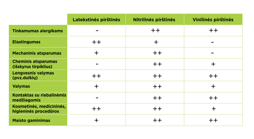 Pirštinių tipų palyginimo lentelė